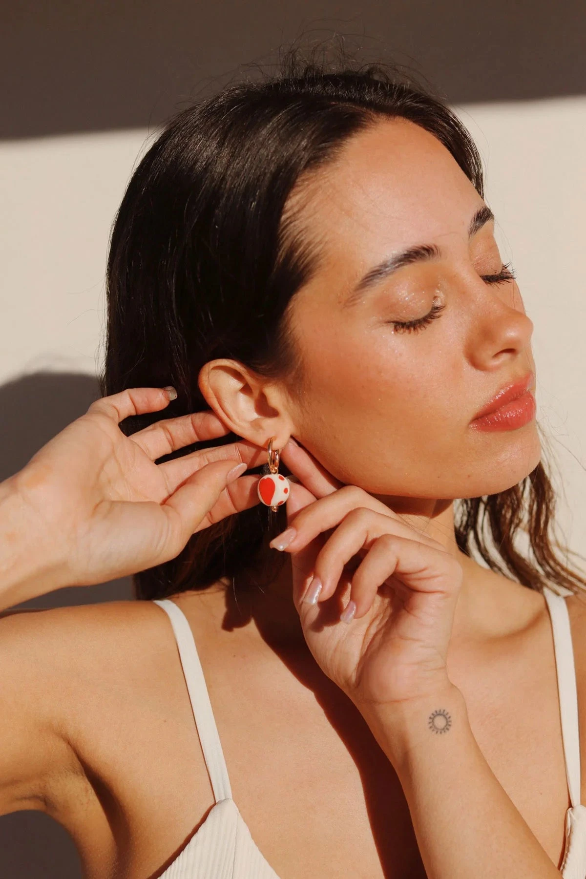 These new drop earrings are sweet like candy. With trendy red heart-painted charms on gold-toned hoops, this pair will be a new staple in your earring collection. Pair them with our Sour Cherry Necklace.